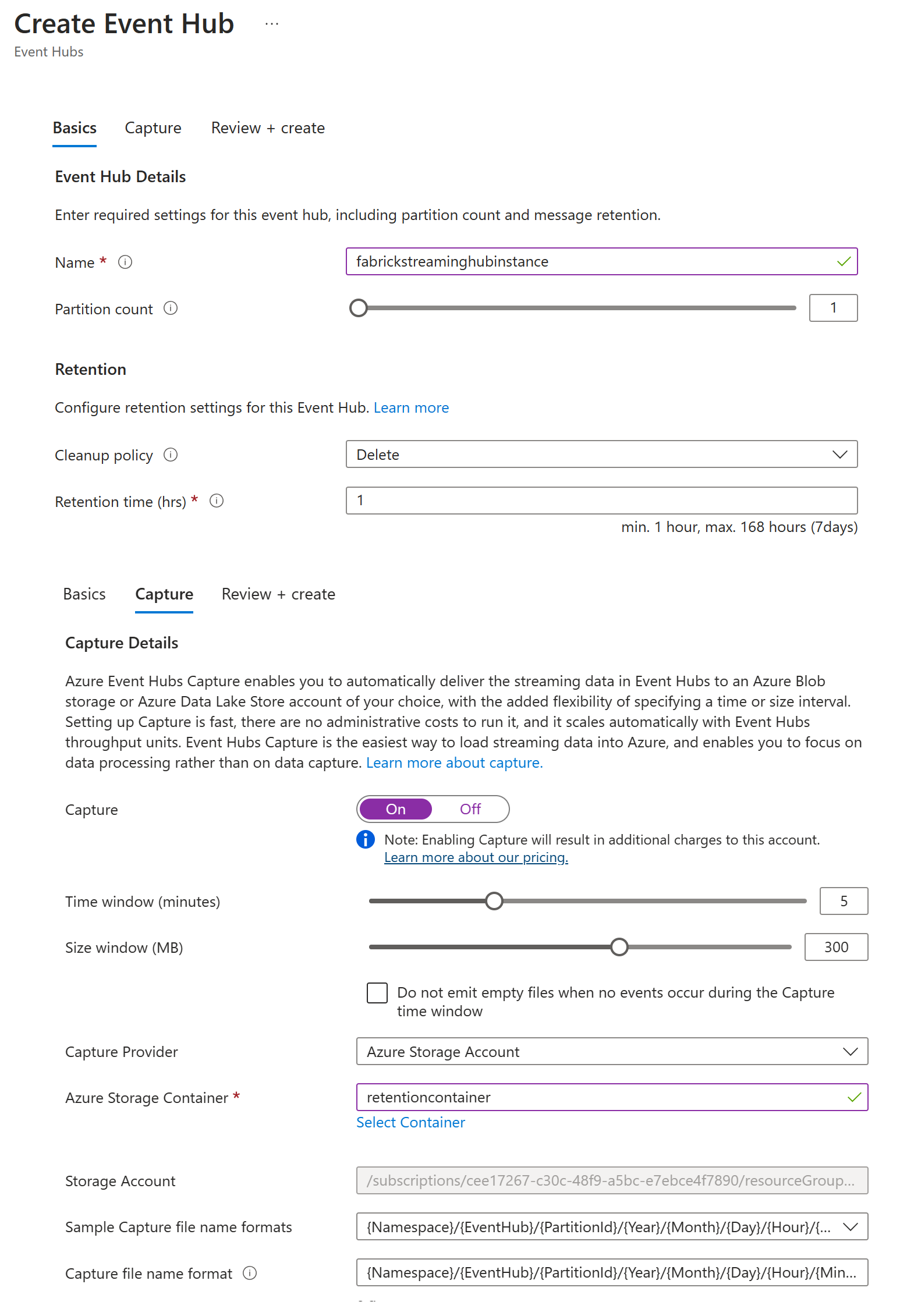 - Un Event Hub (Event Hub Instance), permettant d’être l’instance de capture des données, avec une période de rétention précise :