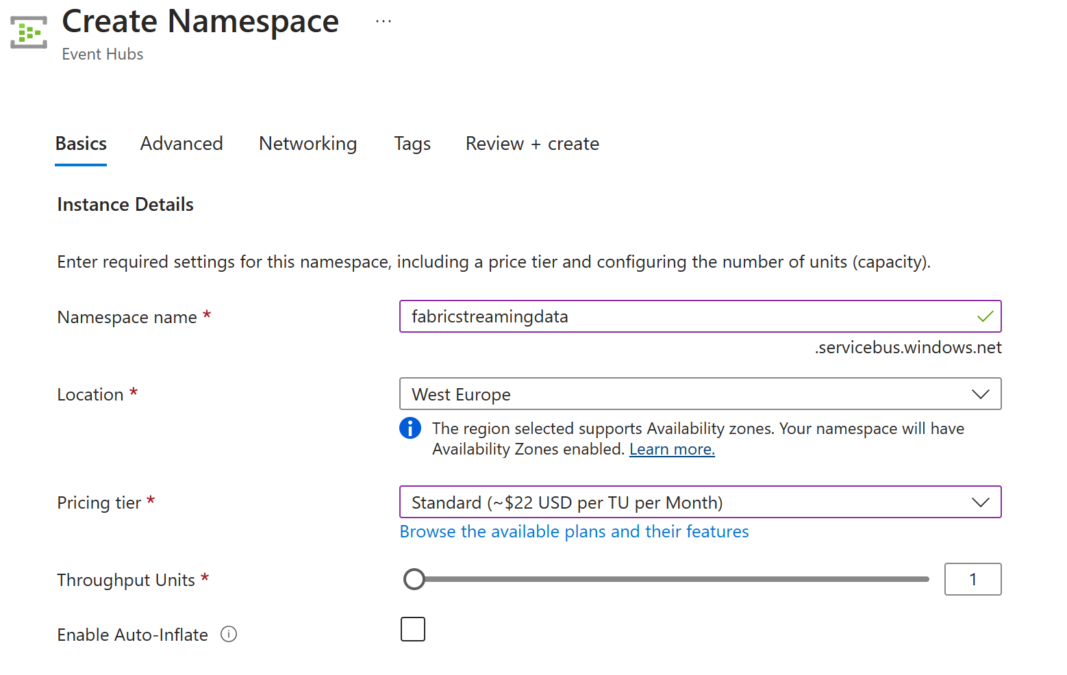 - Une ressource Azure Event Hubs (Event Hub Namespace, ou cluster), qui regroupe un ensemble de plusieurs hubs avec une configuration similaire, ici nous voudrons utiliser le pricing tier standard.