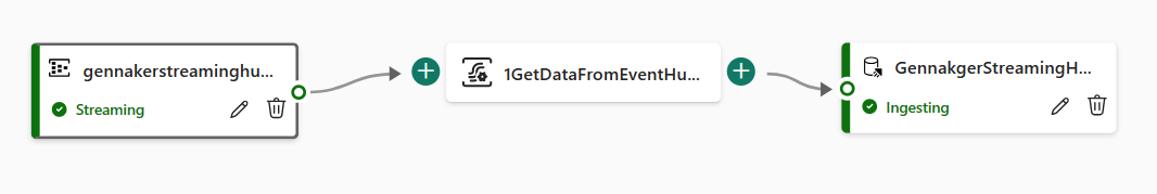 On obtient alors un flux composé d’une source Event Hub, d’un Event Stream central qui va envoyer nos données à notre base au sein du service Microsoft Fabric.