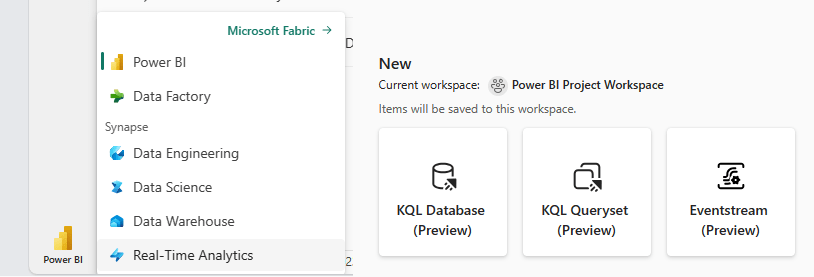 Dans notre espace de travail, on retrouve plusieurs personas : ils simplifient la vue des différents outils mis à disposition au sein de notre capacité, et on retrouve notamment un persona Real-Time Analytics. C’est ici qu’on pourra créer notre base de donnée KQL & notre Event Stream :