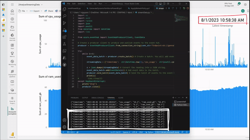 Sur une machine, j’exécute le code suivant permettant de restituer en Python, la quantité de RAM & de CPU (les métriques choisies ici arbitrairement pour notre démonstration) utilisée à l’instant T, et de l’envoyer à notre Event Hub.