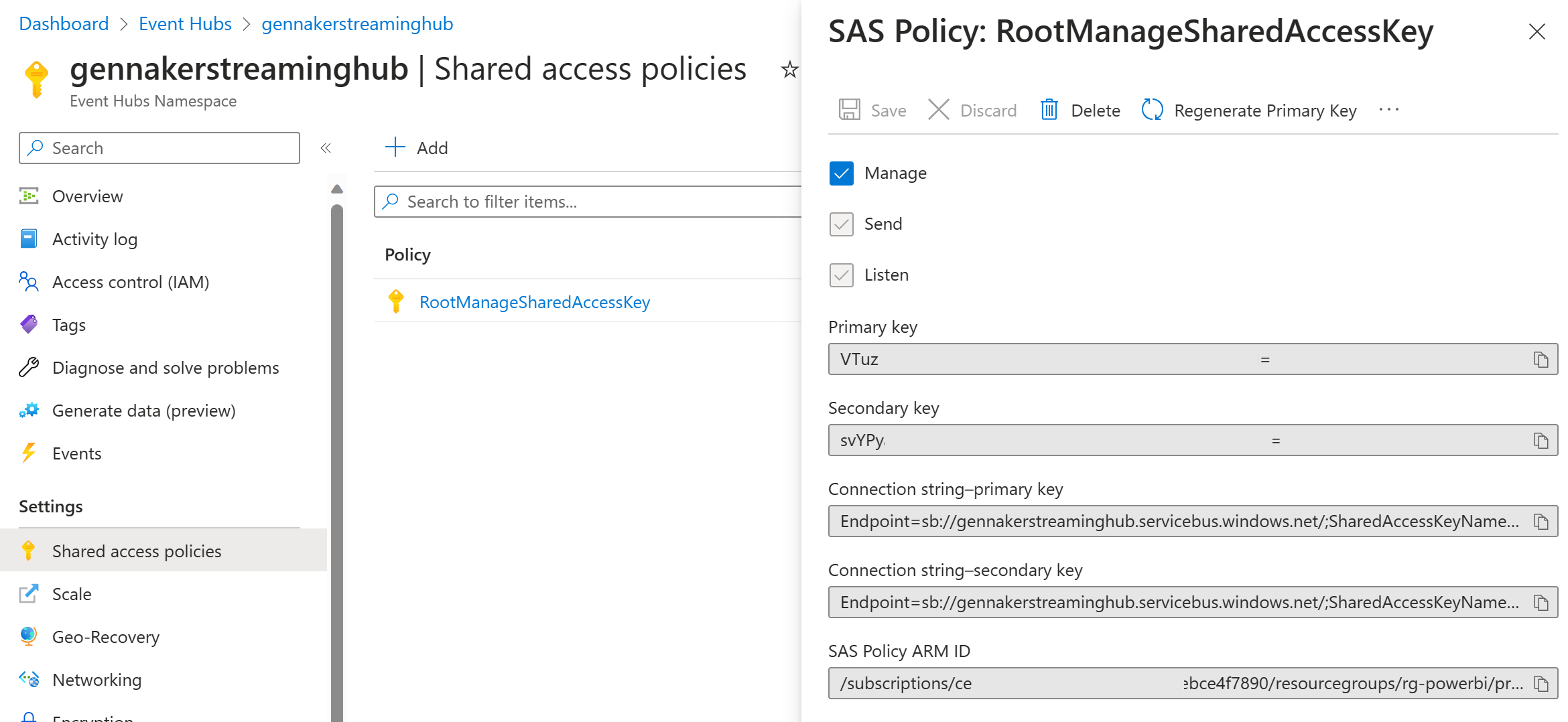 Une fois le hub créé, il est alors possible de l’associer à une activité, et donc d’y envoyer un ensemble d’évènements. Pour y arriver, on voudra noter la connection string & la clé permettant d’atteindre notre Event Hub :
