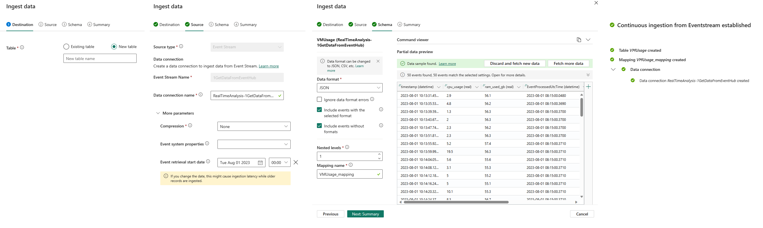 Une fois la KQL Database et l’event stream créés, il faudra paramétrer une source et une destination. Nous choisirons pour destination une base de données Kusto (KQL Database) et pour source l’event hub que nous avons créé.